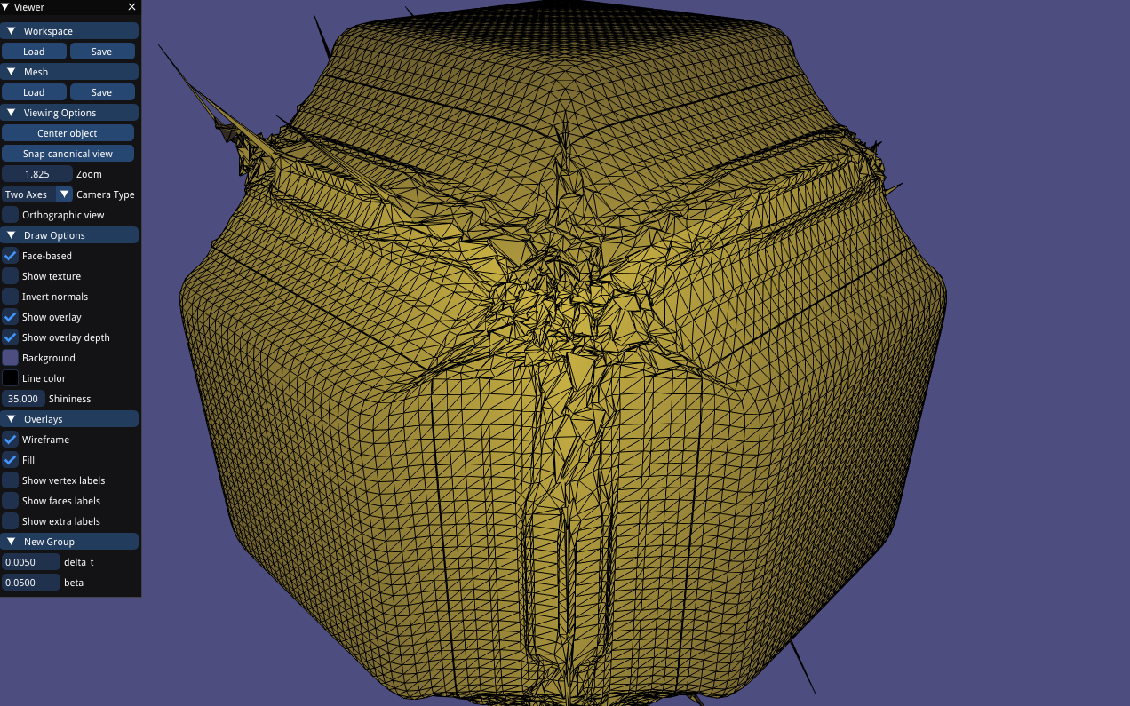 To preserve numerical stability while running the simulation, we have to periodically remesh and remove degenerate geometry. We used an external library which performs isotropic remeshing, modifying it to prevent volume loss during projection step after tangential Laplacian smoothing as well as hooking into its edge-split and edge-collapse routines to interpolate velocity of newly created geometry.