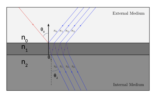 Where $\eta$’s are indices of refraction, $\theta_1$ and $\theta_2$ are incident and transmitted angles respectively (calculated using Snell’s Law). Note that these coefficients can be complex valued, and in the cases of total internal reflection or conductors, these equations are not fully accurate (but this is not a concern for our basic case of a dielectric between two layers of air), describing a phase shift.